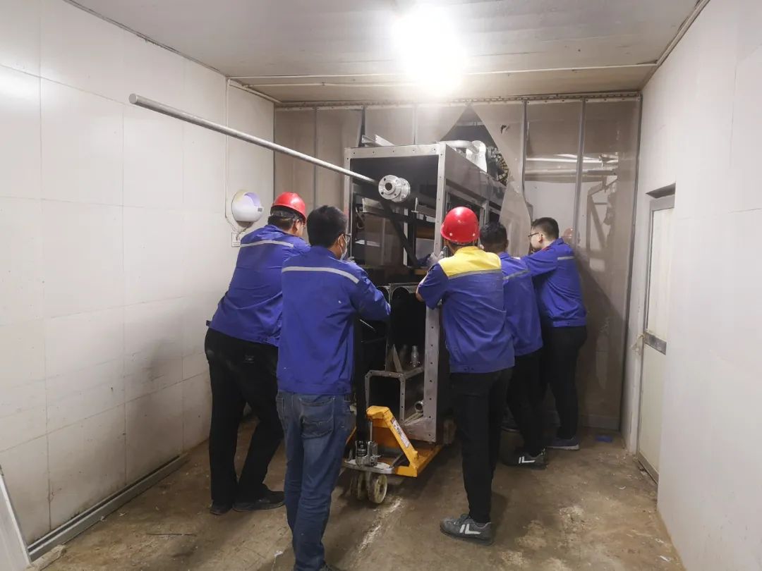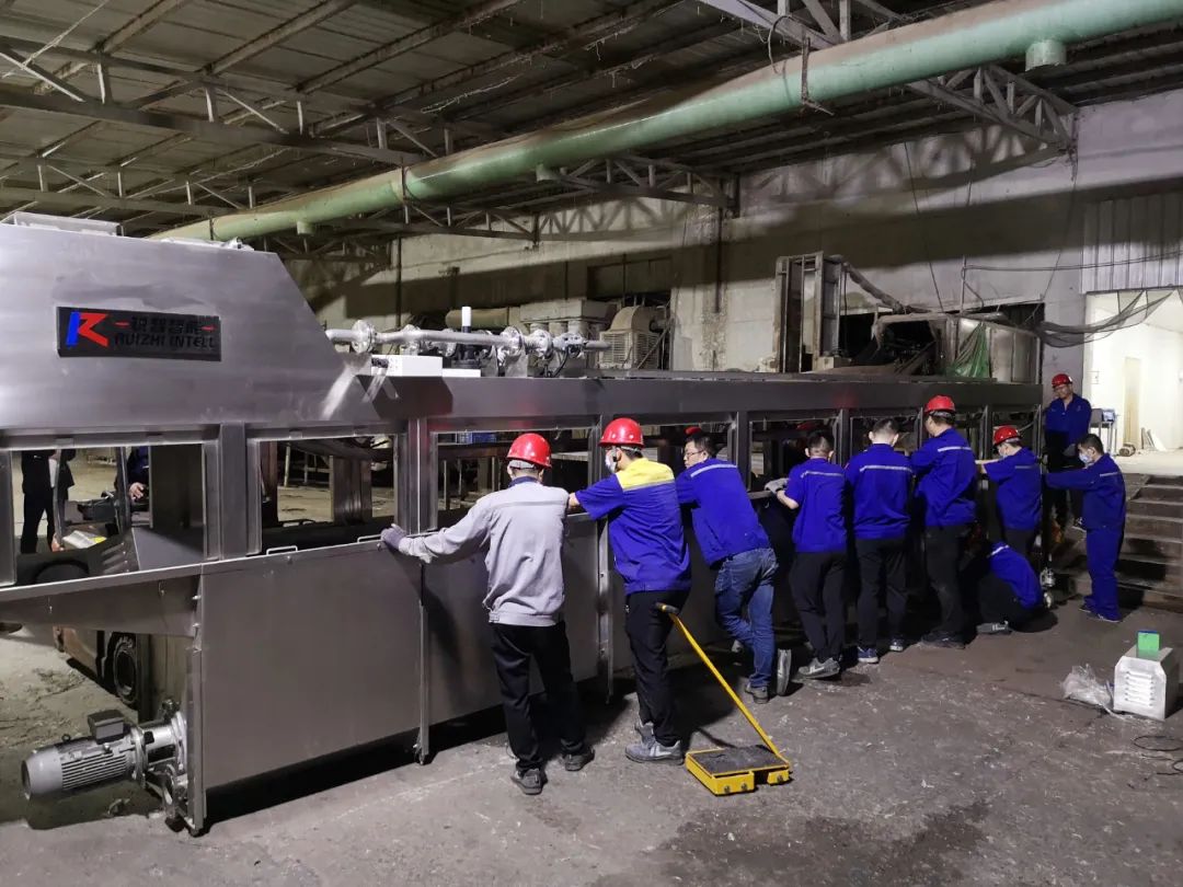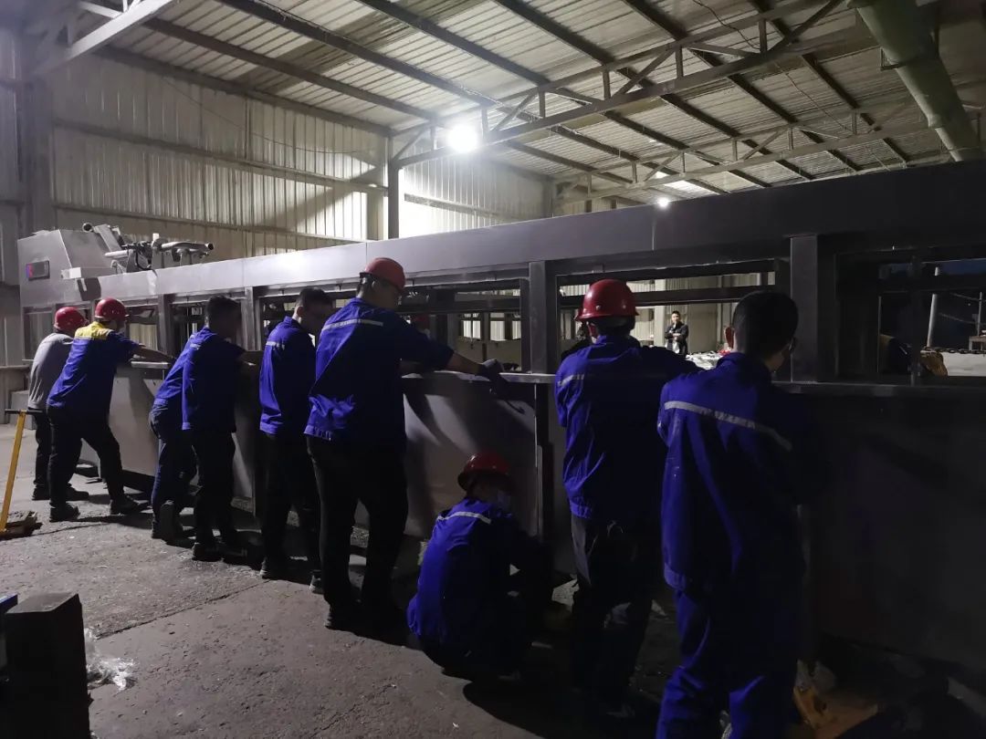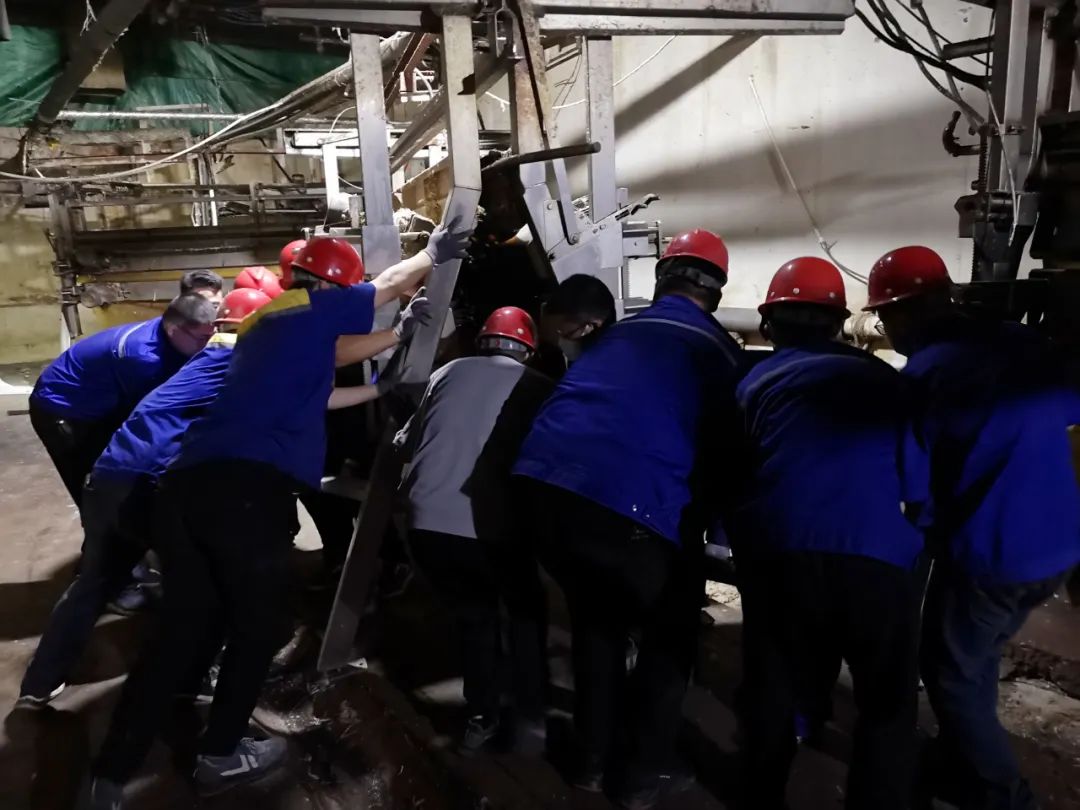 出差現場,三臺脫毛機按工藝要求需要進行回轉調方向工作,因為地面有二道地溝,脫毛機本身很沉重,墊上厚鐵板后車輪過不去,所以為了搶進度大家在仇中茂的提議下,決定采用人工搬抬的方法進行作業。為了防止有人脫手,將槽鋼開口朝下做抬杠,三臺脫毛機每一側需要一點點移動,最后每個人的手上都形成了深深的槽鋼勒痕。脫毛機調好位置后,開始進我們的新設備。與運舊設備不同,新設備要比舊設備更高及更長,舊設備運出是下坡,我們新設備運進是上坡,所以工作難度大了很高,運輸過程中每個人都很細心,重點保護我們的設備不會因為磕碰造成損傷。當晚11點終于把設備運到了指定位置。第二天的工作量就很大了,要完成設備的就位對接、高架線連接架設、拆除的舊設備恢復、連接蒸汽管路、連接水管路、鋪設橋架、連接電氣線路。當晚加大班、聯宿轉,沒有一個人有抱怨或消極怠工,在凌晨極度困乏的情況下都還在堅持工作搶進度...他們犧牲小我,成就大我,最終,圓滿完成任務。